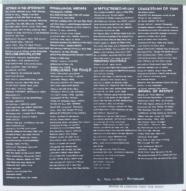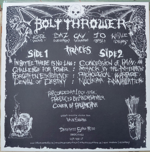 Consisting of 8 tracks and clocking in at just around 28 minutes, the album originally released by Vinyl Solution is arguably BOLT THROWER’s rawest and most primal effort. Despite the uncompromisingly rough sound and their Crust and Punk influences still being rather obvious, the characteristics BOLT THROWER would go on to be hailed for, are already represented albeit in rather crude form, though. Rather than to its detriment, it’s this very unfiltered roughness that`s somewhat missing from their later albums that gives In Battle There Is No Law! its special unmistakable charm. Instead of putting emphasis on distinctive melodies and mid-tempo groove, the songwriting leans more towards all-out attack. Karl’s vocal delivery is a tad different too, at times abandoning his signature style in favour of vocals more akin to Punk rather than Death Metal. Lyrically already dealing with war in its different dark aspects, the first album’s cover depicts a different logo than the rest of their discography. This and the punkish artwork shown on the cover further set BOLT THROWER’s first album apart, turning it into a unique full length among the discography of one of Death Metal’s most important bands.