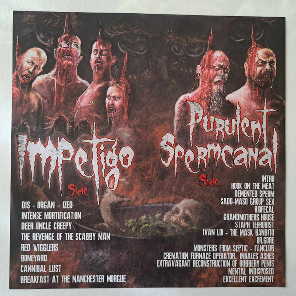 Ultra sick split featuring two best of selections by legendary bands. Impetigo needs no introductions. These Illinois-based freaks shaped a whole genre and are rightfully considered one of the most important goregrind bands that ever disgraced the earth. These songs are all anthems and have been fully remastered for this release. Purulent Spermcanal are one of the most reverred gore-masters from Eastern Europe and decided to re-record a whole bunch of their most classic songs for this incredible split!